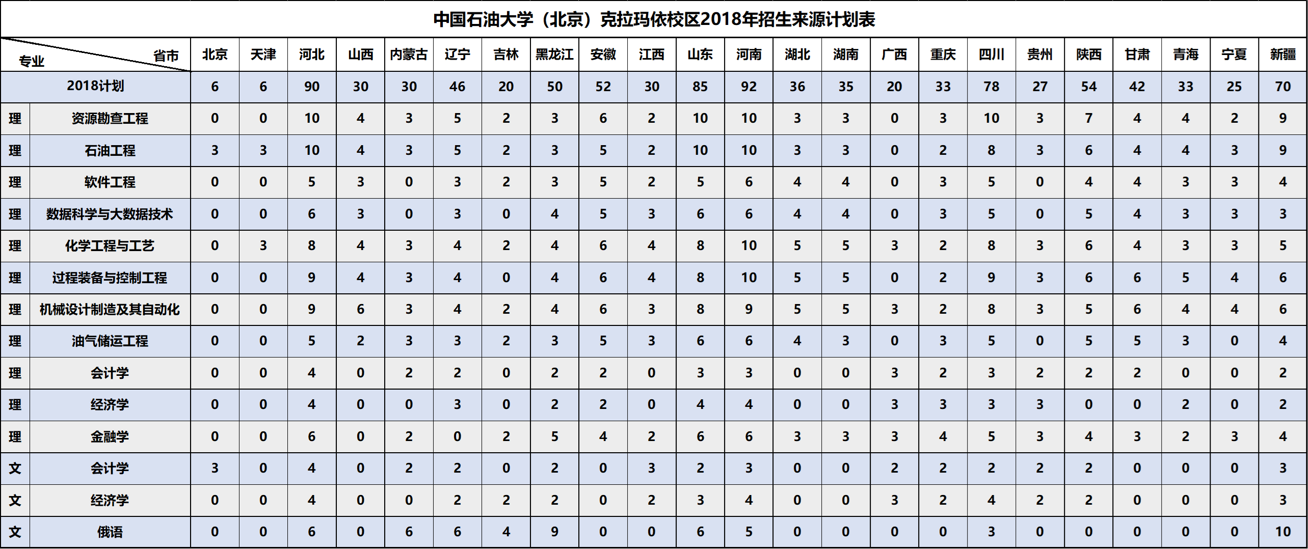 中国石油大学(北京)克拉玛依校区2018年各省招生计划